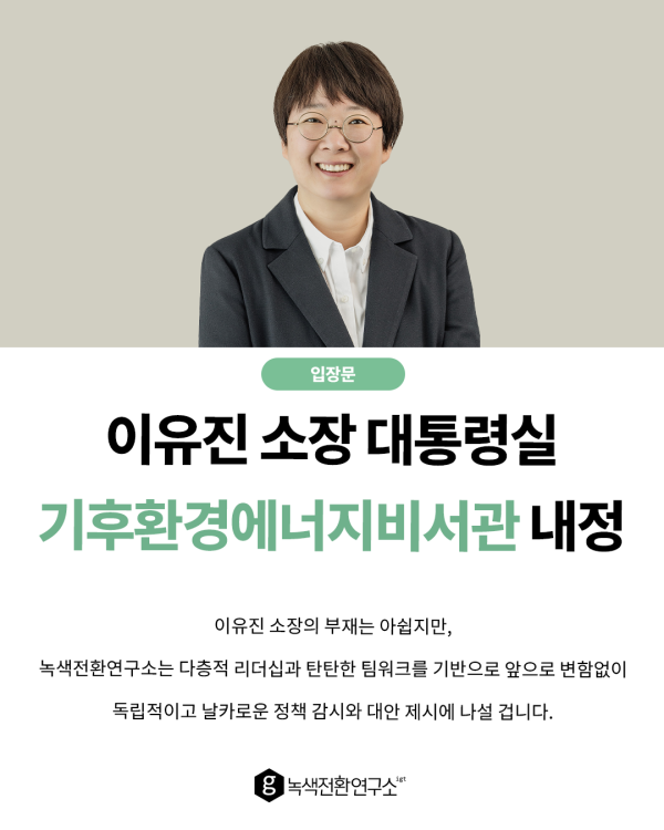 녹색전환연구소는 이유진 소장의 대통령실 기후환경에너지비서관 임명을 환영합니다. 기후대응이 시급한 과제로 떠오른 지금, 녹색전환을 위한 정책 경험과 다양한 이해관계자들과의 소통 역량을 두루 갖춘 인사가 중대한 책임을 맡게 된 것은 뜻깊은 일입니다.