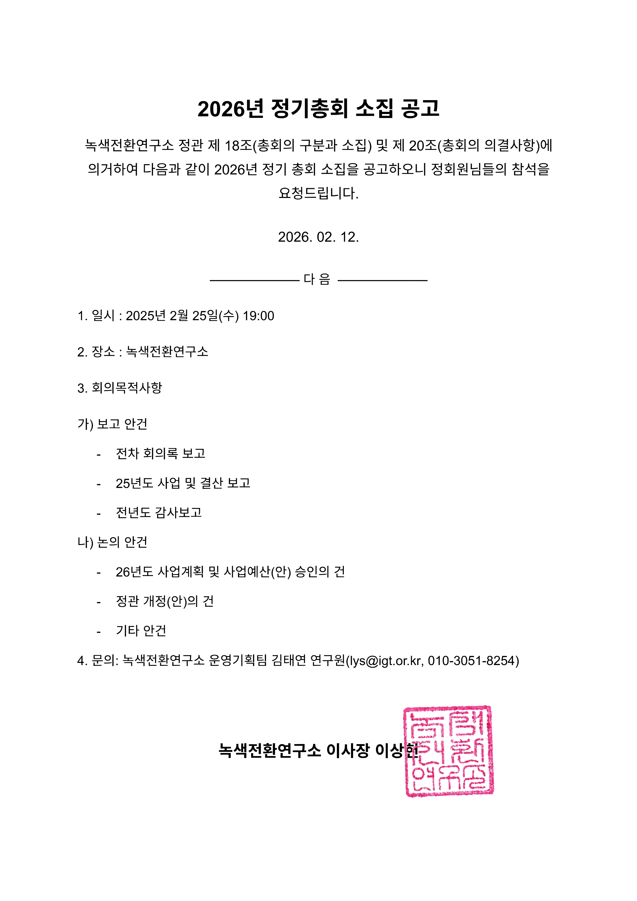 녹색전환연구소 정관 제 18조(총회의 구분과 소집) 및 제 20조(총회의 의결사항)에 의거하여 다음과 같이 2026년 정기 총회 소집을 공고하오니 정회원님들의 참석을 요청드립니다.