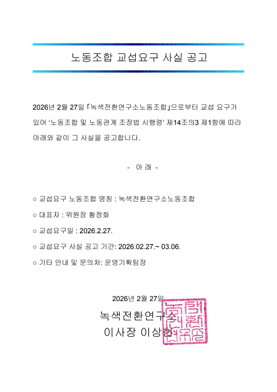 노동조합 교섭요구 사실 공고 2026-02-27 0 83 02.27 09:33 2026년 2월 27일 「녹색전환연구소노동조합」으로부터 교섭 요구가 있어 ‘노동조합 및 노동관계 조정법 시행령’ 제14조의3 제1항에 따라 아래와 같이 그 사실을 공고합니다.