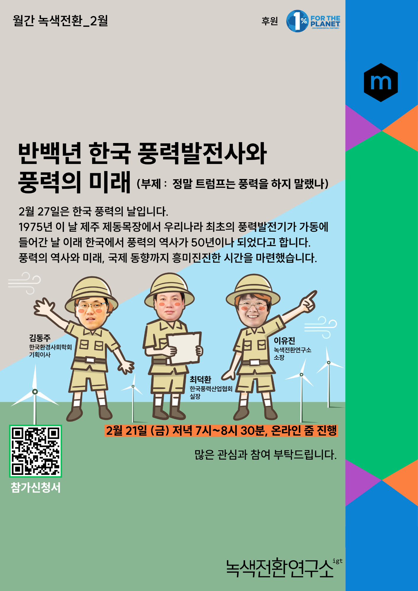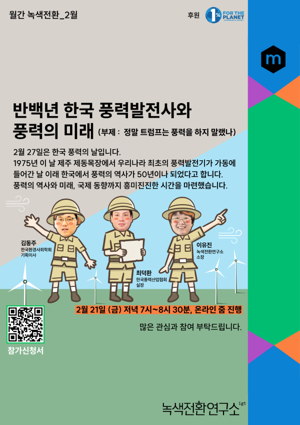 2월 27일은 한국 풍력의 날입니다. 1975년 이 날 제주 제동목장에서 우리나라 최초의 풍력발전기가 가동에 들어간 날 이래 한국에서 풍력의 역사가 50년이나 되었다고 합니다. 풍력의 역사와 미래, 국제 동향까지 흥미진진한 시간을 마련했습니다.