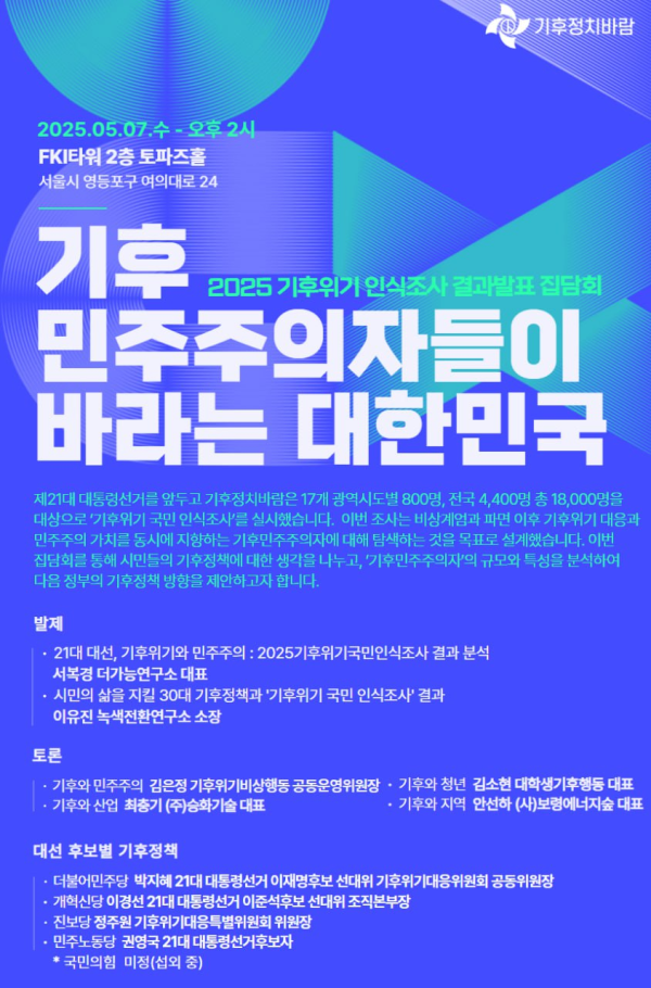 제21대 대통령선거를 앞두고, <기후정치바람>은 전국 17개 광역시도별 800명, 전국 4,400명 총 18,000명을 대상으로 ‘기후위기 국민 인식조사’를 실시했습니다. 본 조사는 계엄과 파면 이후, 기후위기 대응과 민주주의라는 두 가치를 함께 지향하는 ‘기후민주주의자’를 탐색하는 데 초점을 맞췄습니다. 이번 집담회를 통해 시민들의 기후정책에 대한 생각을 나누고, ‘기후민주주의자’의 규모와 특성을 분석하여 다음 정부의 기후정책 방향을 제안하고자 합니다.