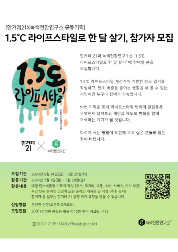 한겨레 21과 녹색전환연구소는 7월 한 달동안 '1.5℃ 라이프스타일로 한 달 살기' 를 실천할 시민을 모집합니다. 1.5℃ 라이프스타일 계산기에 기반한 탄소 일기를 매일 작성하고, 탄소 배출을 줄이는 생활을 해 볼 수 있는 시민이면 누구나 참여가 가능합니다. 참여자들의 이야기를 통해서 라이프스타일의 변화는 어떻게 가능할지 톺아보는 계기가 될 것입니다.