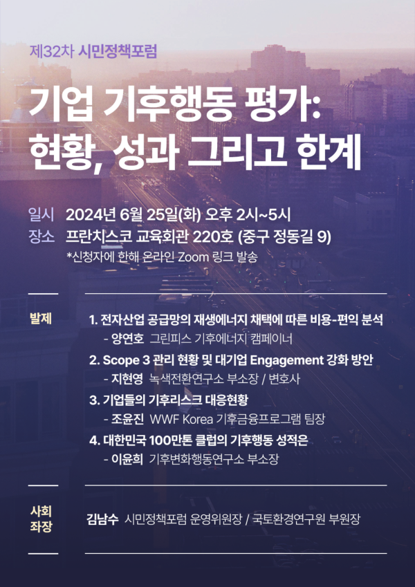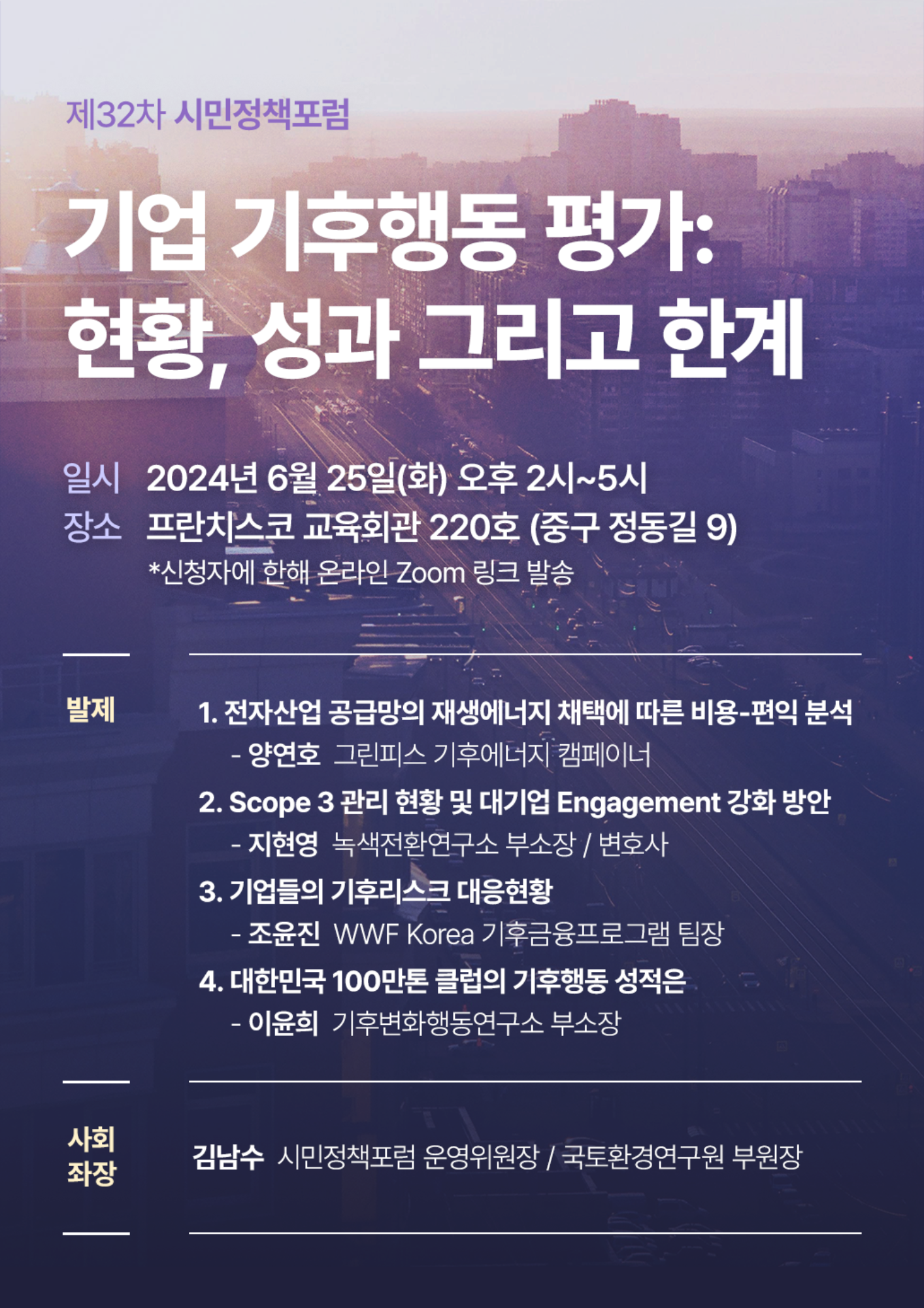 [포럼] 기업 기후행동 평가 : 현황, 성과 그리고 한계 2024-06-18 0 54 2024.06.18 09:33 ✔️ 일시 : 2024년 6월 25일 (화) 오후 2시 ~ 5시✔️ 장소 : 프란치스코 교육회관 220호 (중구 정동길 9)✔️ 참가신청 https://zrr.kr/M2q2 신청자에 한해 온라인 Zoom 링크 발송