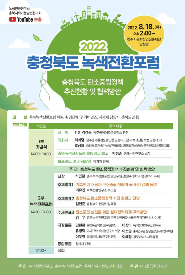충청북도의 탄소중립 정책과 현재까지의 추진 현황을 살펴보고 협력방안을 모색하기 위한 '충청북도 녹색전환포럼'이 열립니다. 이번 포럼은 충청북도 환경산림국, 시민사회단체 등 민관이 협력하는 자리이며 시민도 참여할 수 있습니다.