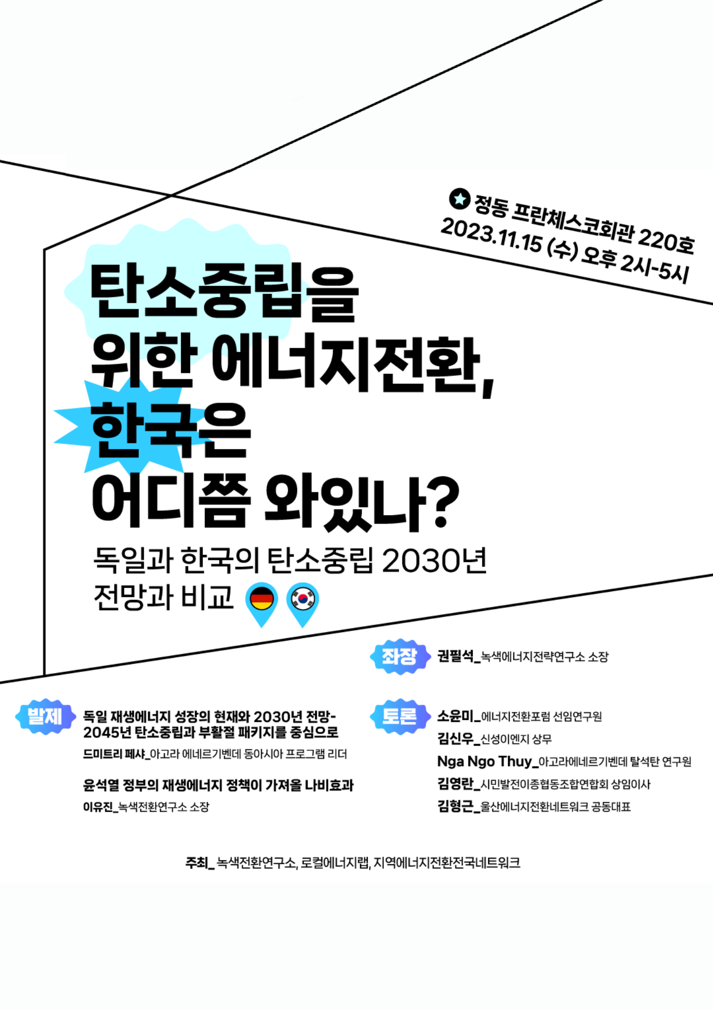 녹색전환연구소와 지역에너지전환전국네트워크, 로컬에너지랩은 한국사회의 탄소중립을 위한 에너지 전환의 현재와 앞으로 나아갈 방향을 모색하고자 합니다. 이를 위해 독일의 탄소중립 정책과 재생에너지 성장의 사회적 배경과 그 목적을 독일의 대표 에너지 관련 싱크탱크인 아고라 에네르기벤데의 연구자들을 통해 확인하고 한국의 상황을 검토하고자 합니다. 이를 통해 우리사회가 나아가야할 탄소중립의 전략으로 에너지 전환 과제를 고민하고자 합니다.