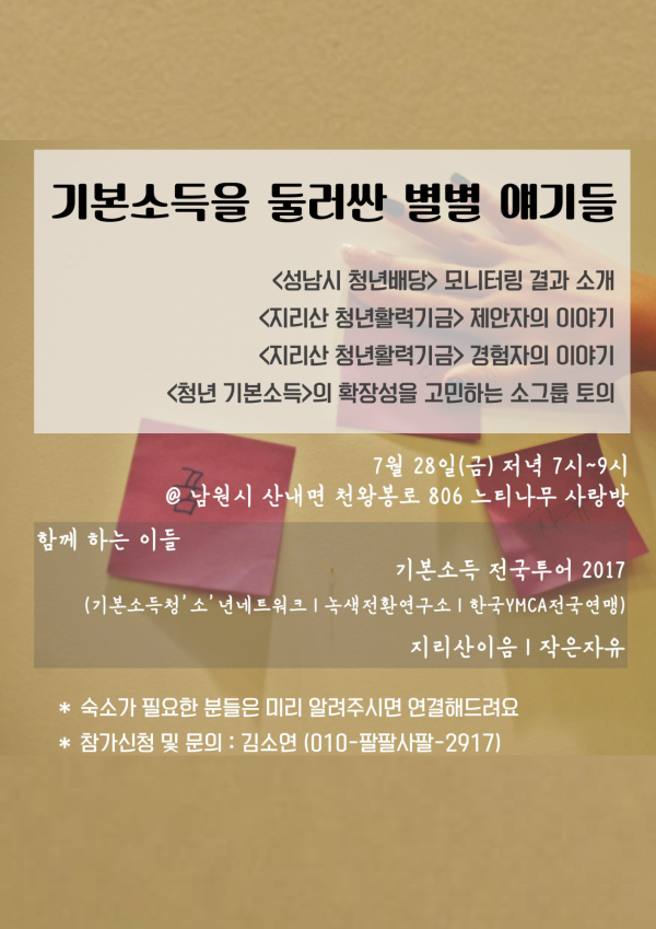 [강연안내] 2017 방방곡곡 기본소득 수다투어_지리산 2017-07-25 0 49 2017.07.25 09:33 [강연안내] 2017 방방곡곡 기본소득 수다투어_지리산 2017-07-25