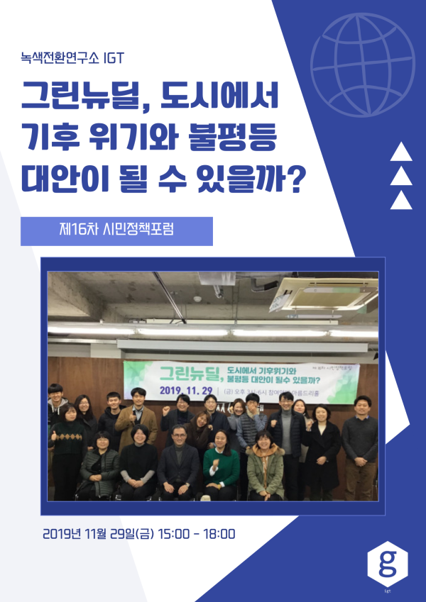 [기획포럼] 그린뉴딜, 도시에서 기후 위기와 불평등 대안이 될 수 있을까? 2019-12-02 0 52 2019.12.02 09:33 제16차 시민정책포럼 "그린뉴딜, 도시에서 기후 위기와 불평등 대안이 될 수 있을까?"가11월 29일 금요일 오후3시~6시에 성황리에 개최되었습니다. 참가해주신 모든 분들께 감사드리며 다음에 더 좋은 기획과 구성으로 찾아뵙겠습니다.감사합니다.