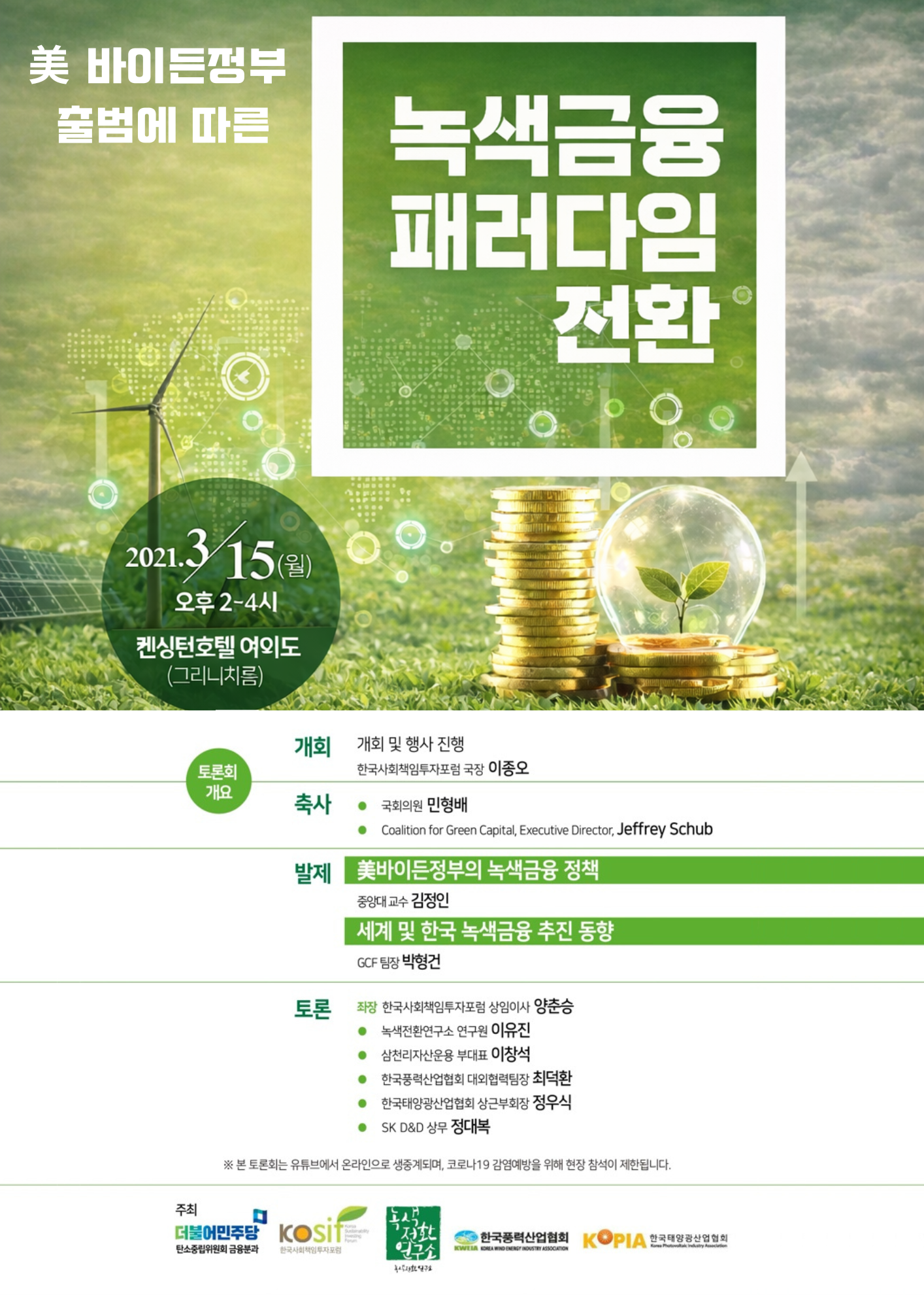 주최 : 더불어민주당 탄소중립위원회 금융분과, 한국사회책임투자포럼, 녹색전환연구소, 한국풍력산업협회, 한국태양광산업협회