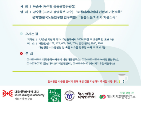 제3차 생태적 기본소득 포럼 "돌봄사회와 생태적기본소득" 개최 안내 2014-03-13 0 49 2014.03.13 09:33 제3차 생태적 기본소득 포럼 "돌봄사회와 생태적기본소득" 개최 안내 2014-03-13