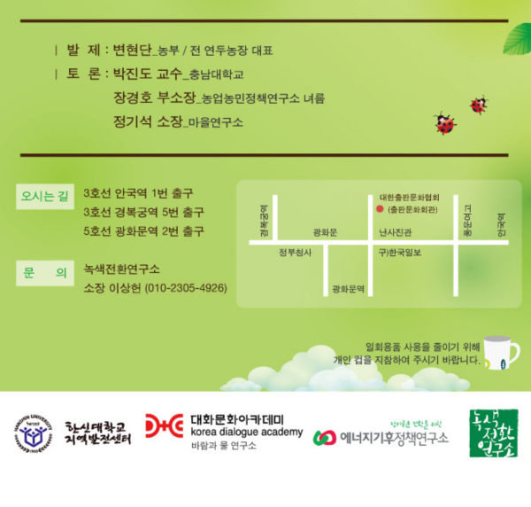 제4차 생태적 기본소득 포럼 "탈성장과 좋은 삶을 위한 농민 기본소득" 개최 안내 2014-04-21 0 51 2014.04.21 09:33 제4차 생태적 기본소득 포럼 "탈성장과 좋은 삶을 위한 농민 기본소득" 개최 안내 2014-04-21