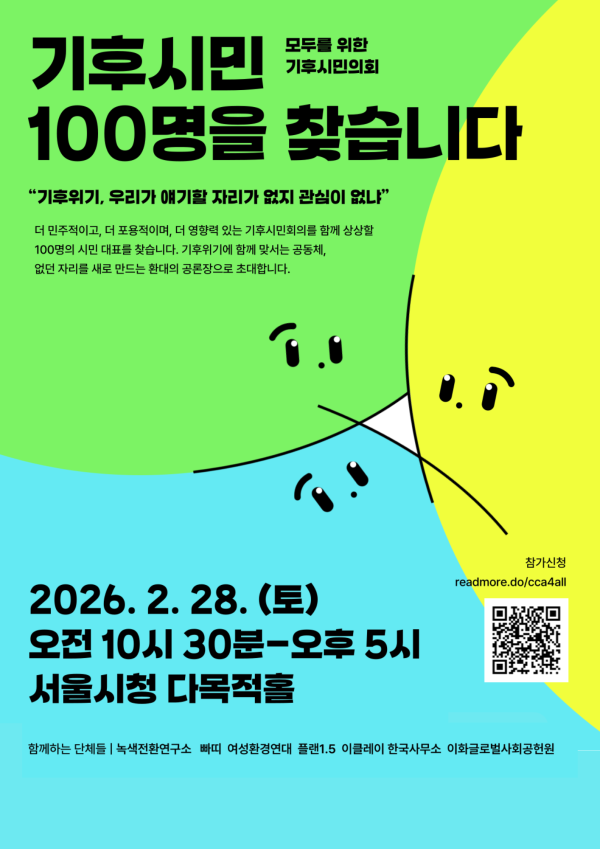 기후위기에 함께 맞서는 공동체로서, 없던 자리를 새로 만드는 환대의 공론장에 100명의 시민을 초대합니다.