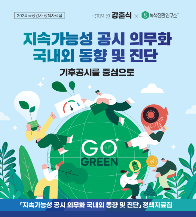 녹색전환연구소는 국회 정무위원회 더불어민주당 강훈식 의원과 공동으로 2024 국정감사 정책자료집 [지속가능성 공시 의무화 국내외 동향 및 진단 : 기후공시를 중심으로]를 발간하였습니다.