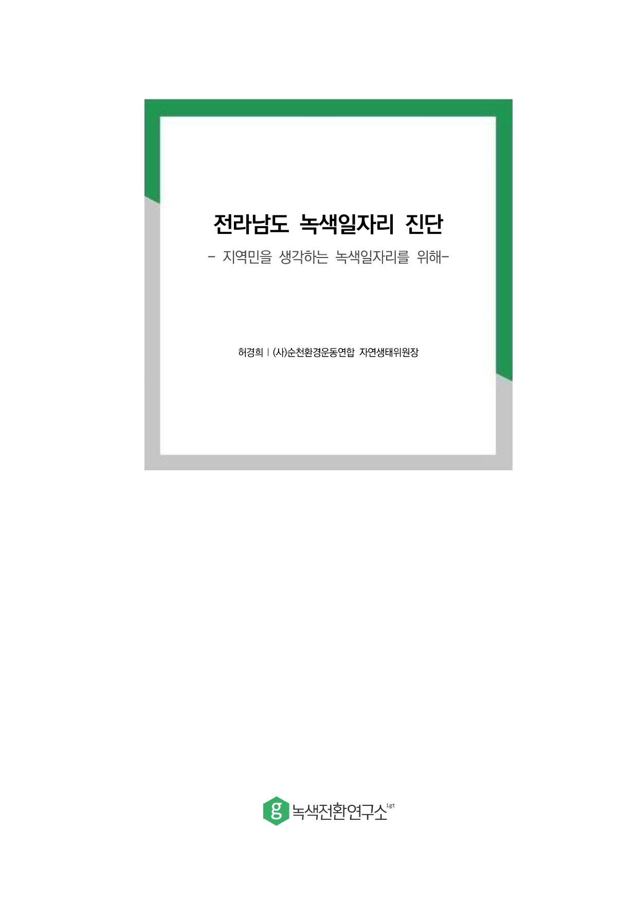 녹색전환연구소는 우리나라의 녹색일자리 현황을 진단하고자 17개 광역시도의 ‘녹색일자리 이슈페이퍼(이하 이슈페이퍼)'를 지역의 공동연구원과 함께 수행했으며, 2023년 7월 11일(화) 허경희 지역연구원((사)순천환경운동연합 자연생태위원장)과 함께 「전라남도 녹색일자리 진단」를 발간했다.