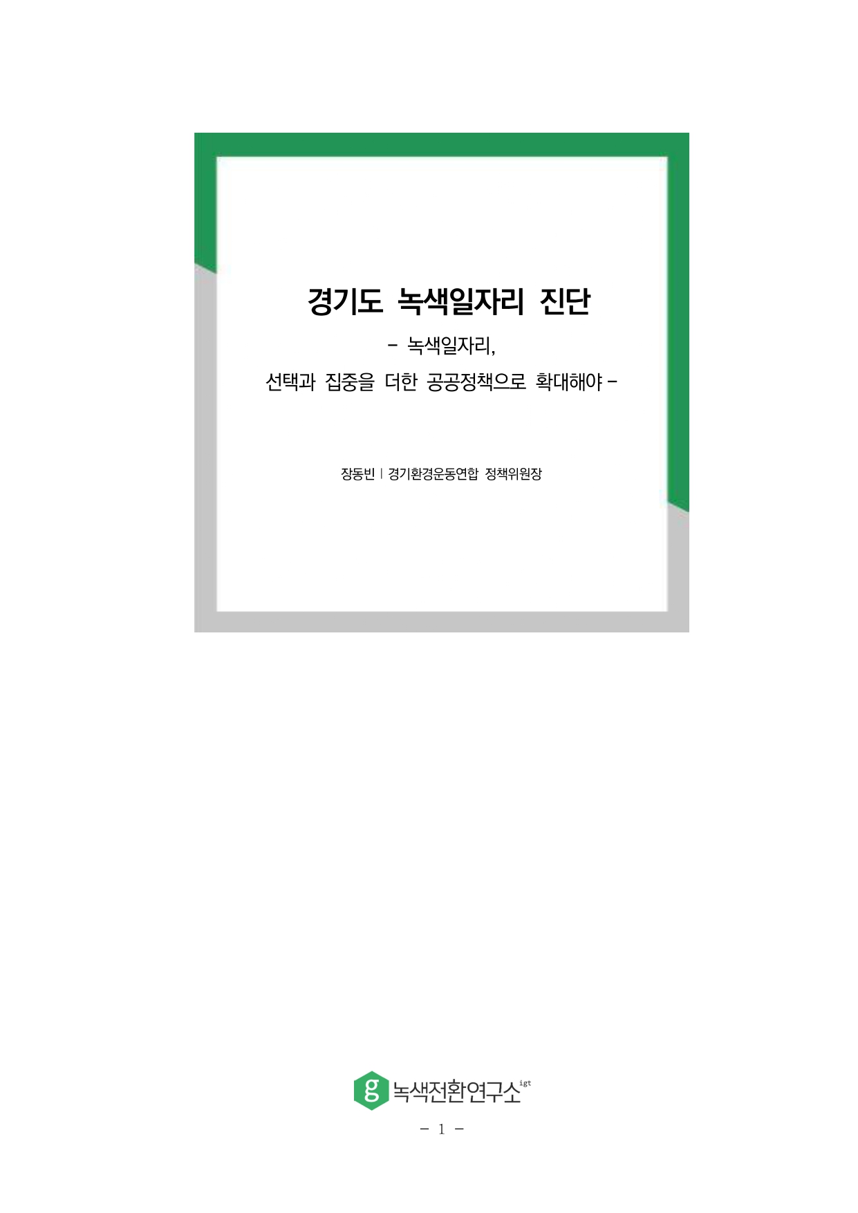 녹색전환연구소는 우리나라의 녹색일자리 현황을 진단하고자 17개 광역시도의 ‘녹색일자리 이슈페이퍼(이하 이슈페이퍼)'를 지역의 공동연구원과 함께 수행했다. 2023년 7월 20일(수) 장동빈 지역연구원(경기환경운동연합 정책위원장)과 함께 「경기도 녹색일자리 진단」를 발간했다.