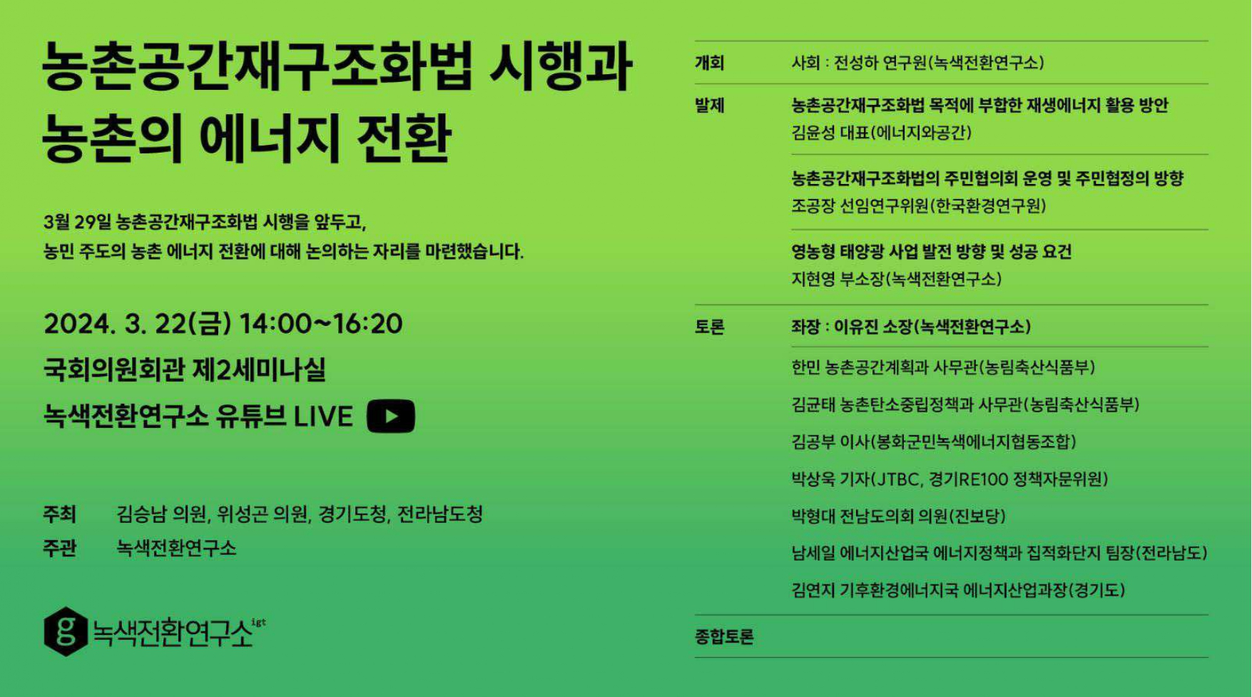 [토론회] 농촌공간재구조화법 시행과 농촌의 에너지 전환 2024-05-22 0 13 2024.05.22 09:33 소개 첨부파일 농촌공간재구조화법 시행과 농촌의 에너지 전환 토론회 전자 자료집_20240322.pdf 요약