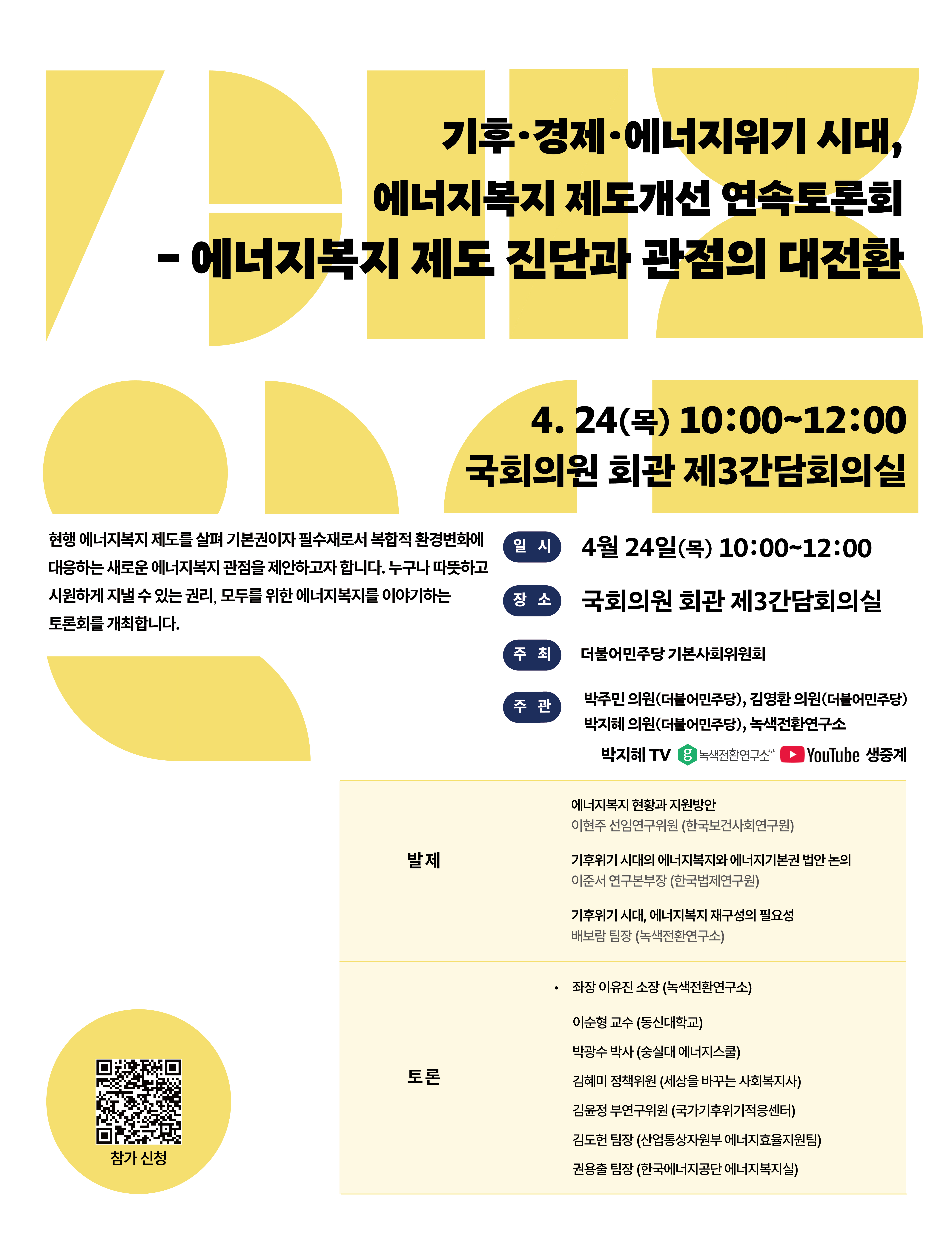 [토론회 자료집] 기후·경제·에너지위기 시대, 에너지복지 제도개선 연속토론회 - 에너지복지 제도 진단과 관점의 대전환 2025-04-25 0 19 2025.04.25 09:33 소개 첨부파일 0. 에너지복지 제도 진단과 관점의 대전환 자료집 전체_20240424.pdf 요약