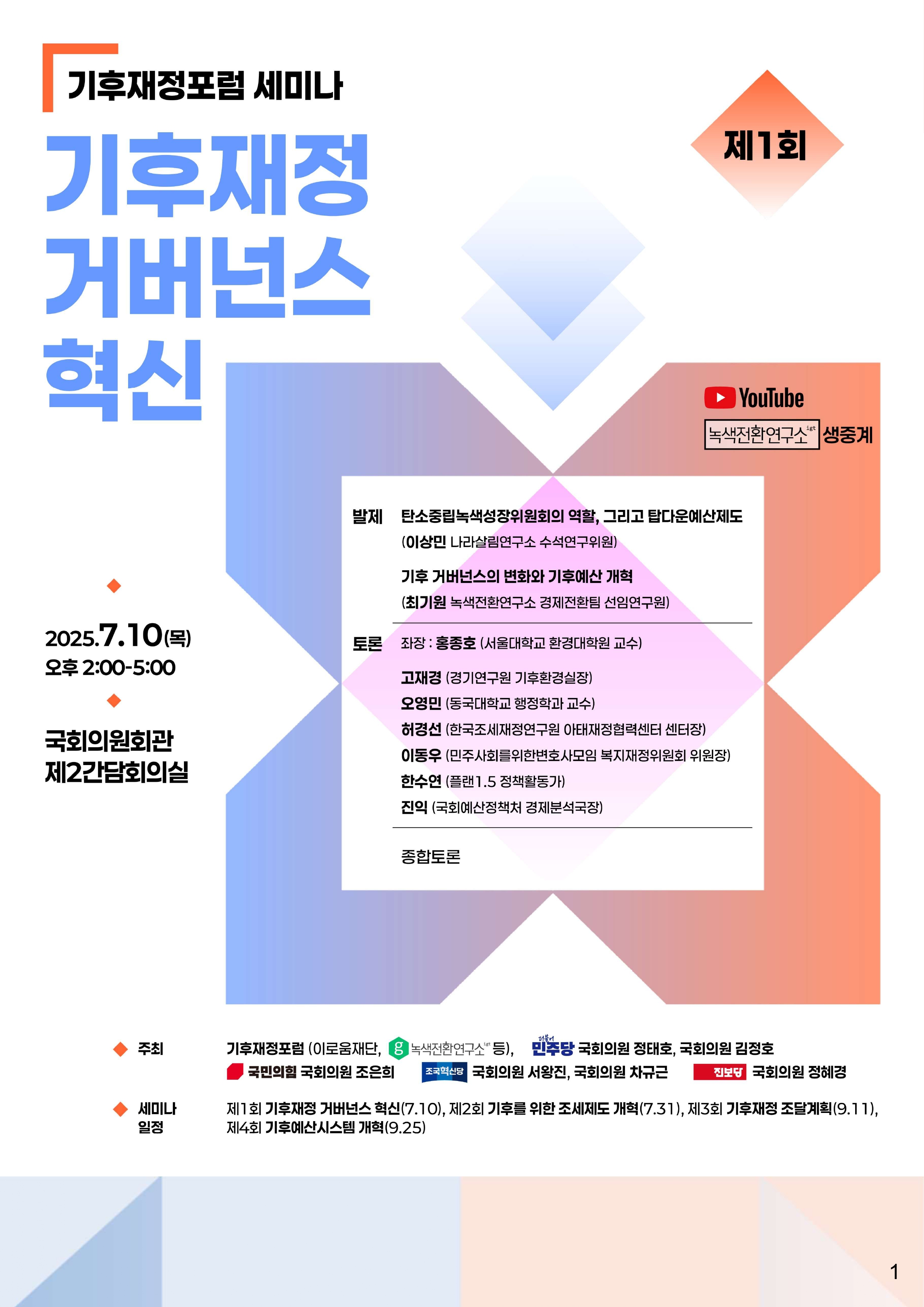 [토론회 자료집] 제1회 기후재정포럼 세미나 "기후재정 거버넌스 혁신" 2025-07-10 0 20 2025.07.10 09:33 소개 첨부파일 [토론회 자료집] 제1회 기후재정포럼 세미나 기후재정 거버넌스 혁신.pdf 요약