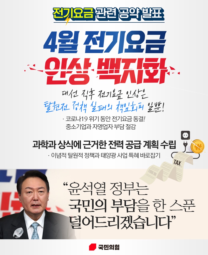 대선에서 ‘4월 전기세 요금 인상 백지화’를 공약했던 국민의힘 ⓒ국민의힘