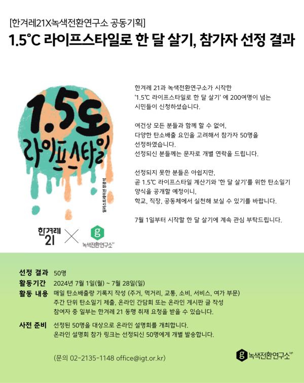한겨레 21과 녹색전환연구소가 시작한 '1.5℃ 라이프스타일로 한 달 살기' 에 200여명이 넘는 시민들이 신청하셨습니다.