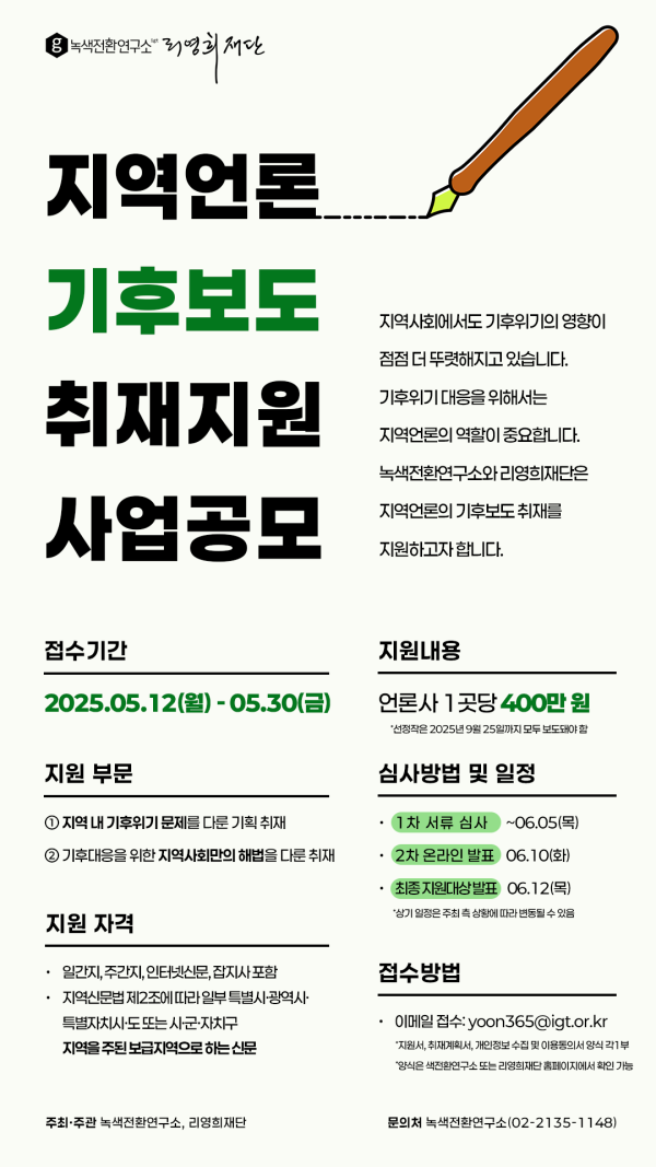 지역사회에서도 기후위기의 영향이 점점 더 뚜렷해지고 있습니다. 이에 대한 정확한 인식과 대응이 절실합니다. 이에 녹색전환연구소와 리영희재단은 기후위기에 대응하는 한국 언론의 역할 강화를 위해 ‘지역언론 기후보도 취재 지원사업’을 공동으로 추진합니다.