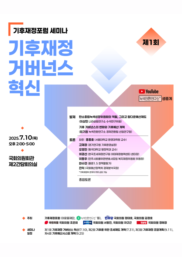 주최: 기후재정포럼 (이로움재단, 녹색전환연구소 등) │ 더불어민주당 정태호 국회의원, 김정호 국회의원 │ 국민의힘 조은희 국회의원 │ 조국혁신당 서왕진 국회의원, 차규근 국회의원 │ 진보당 정혜경 국회의원