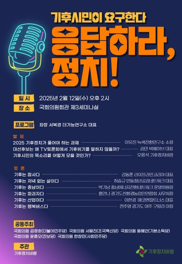 이번 토론회는 시민들이 자기 삶이 기후와 어떻게 연결되어 있는지, 그로 인해 겪는 어려움과 문제는 무엇인지 직접 이야기하는 장입니다. 이를 통해 정치가 응답하고, 해결해야 할 과제가 무엇인지 공론화하는 자리입니다.