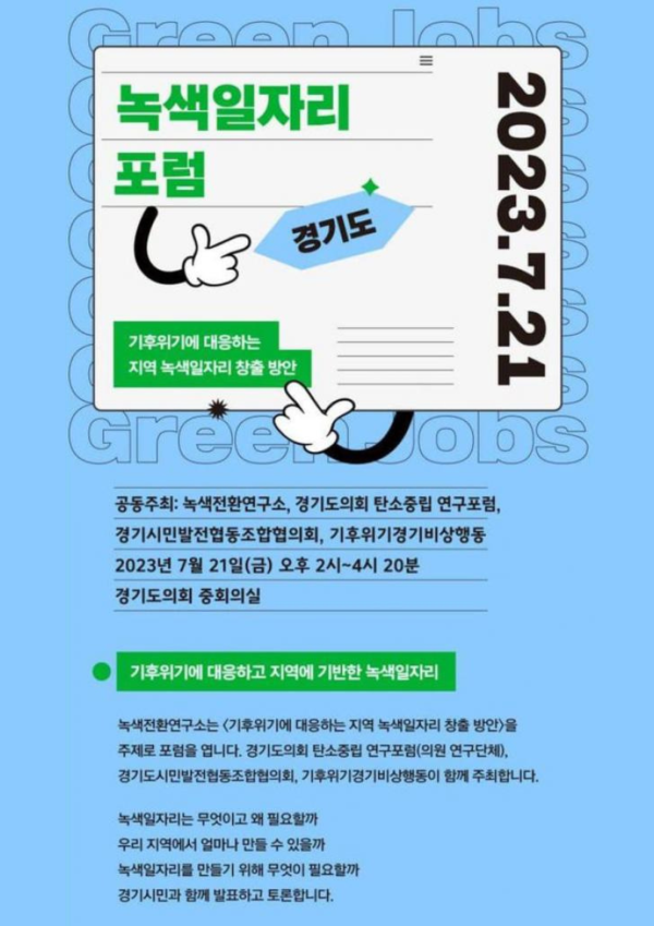 <경기도 녹색일자리 포럼>은 녹색전환연구소, 경기도의회 탄소중립 연구포럼, 경기시민발전협동조합협의회, 기후위기경기비상행동이 함께 주최합니다.