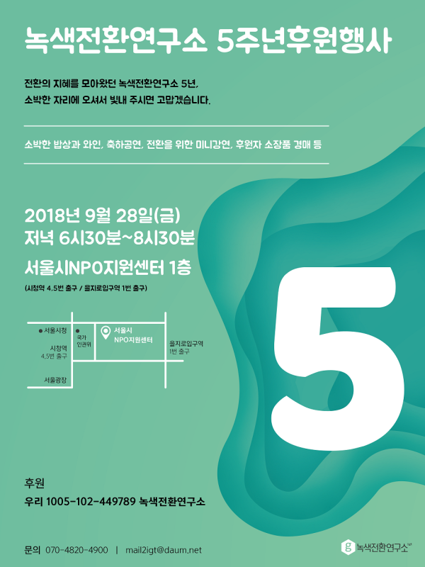 녹색전환연구소 5주년 후원행사 2018-08-31 0 56 2018.08.31 09:33 전환의 지혜를 모아왔던녹색전환연구소 5년. 소박한 자리에 오셔서 빛내 주시면 고맙겠습니다. 프로그램 : 소박한 밥상과 와인 / 축하공연 / 전환을 위한 미니강연 / 후원자 소장품 경매 등▪ 일시 : 2018년 9월 28일(금) 저녁 6시30분~8시30분▪ 장소 : 서울시NPO지원센터 1층▪ 문의 : 녹색전환연구소(070-4820-4900/mail2igt@daum.net)▪ 후원 : 우리 1005-102-449789 녹색전환연구소